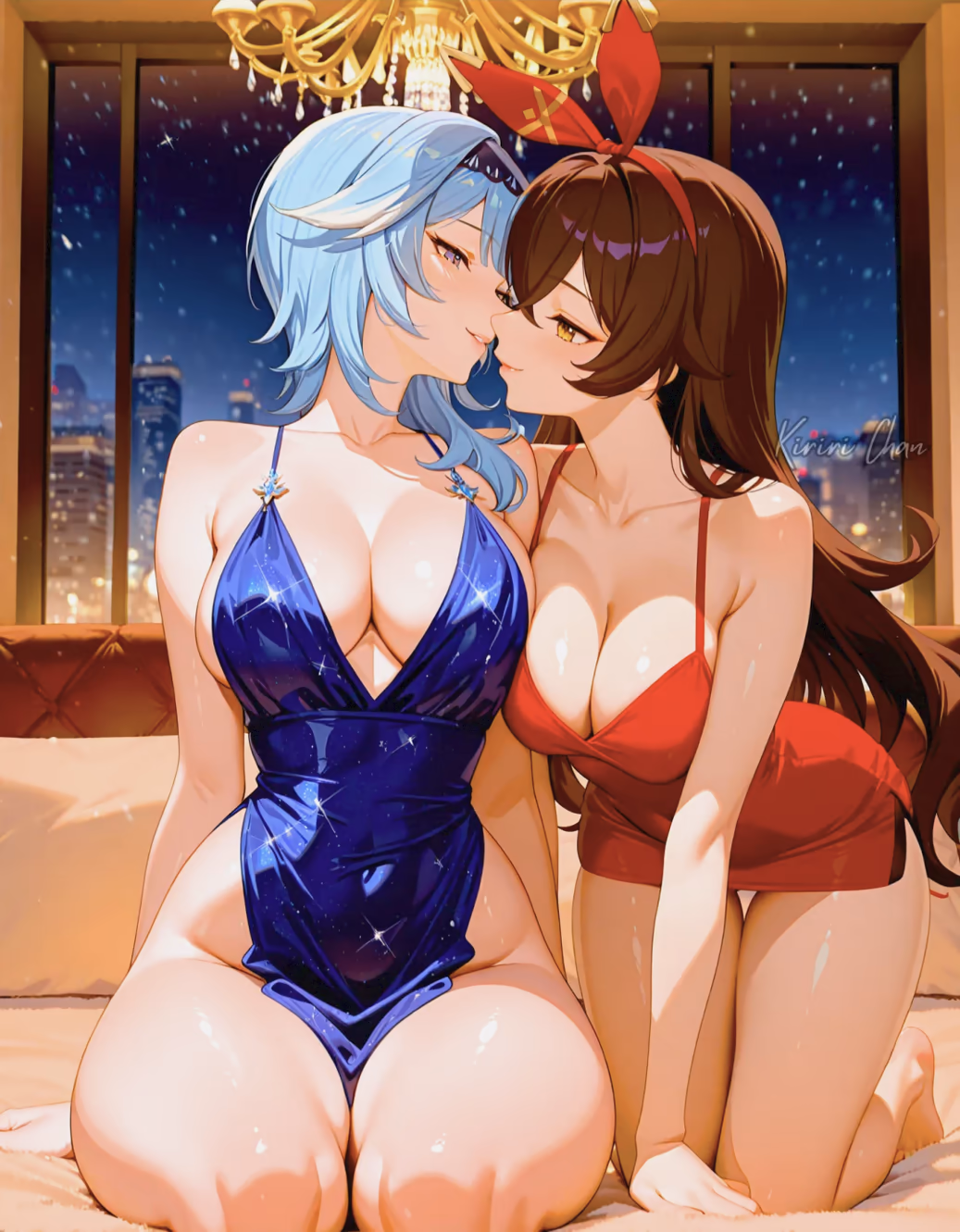 The gentle twilight breeze of Mondstadt, usually a playful caress, seemed to hold its breath tonight, a silent conspirator in the intimate drama unfolding within Eula Lawrence’s usually austere, yet now warmly lit, home. Outside, the last rays of the setting sun painted the sky in hues of soft violet and fiery orange, mirroring the turbulent, beautiful emotions stirring between the Spindrift Knight and her beloved Outrider, Amber. The air inside was thick with the scent of a floral sachet Eula preferred, mingled with the faint, comforting aroma of Amber’s own unique scent, a mix of adventure, gunpowder, and an indescribable sweetness that always seemed to cling to her.