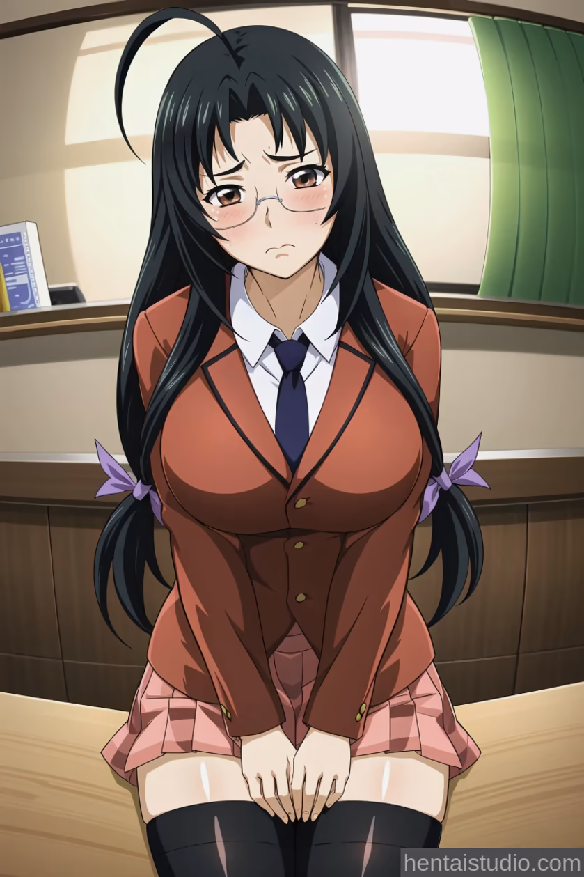 The soft glow of the desk lamp cast a warm, golden halo around Bunwa Kaku, illuminating the delicate curve of her cheekbone and the slight furrow of concentration between her brows. Her usual calm, intellectual demeanor was as present as ever, her slender fingers tracing lines in the ancient tome before her. She adjusted her glasses, the subtle movement drawing my gaze to the way her uniform shirt strained ever so slightly over the magnificent swell of her chest.
