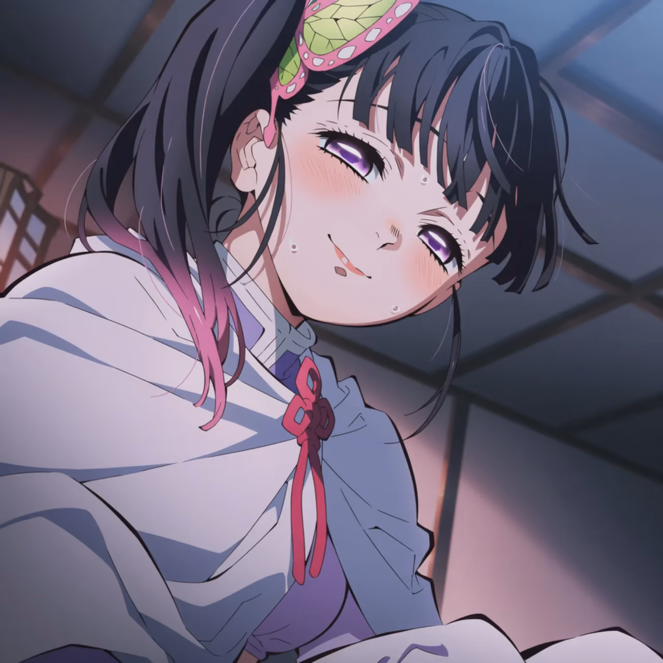 The air in the hidden mountain estate was thick with the scent of cedar and late-blooming camellias. Peace had settled over the land like a soft blanket, a quiet that was once so foreign, now a gentle, constant companion. Kanao Tsuyuri sat on the polished wood of the engawa, her dark ponytail, tied with her signature butterfly ornament, swaying softly in the evening breeze.