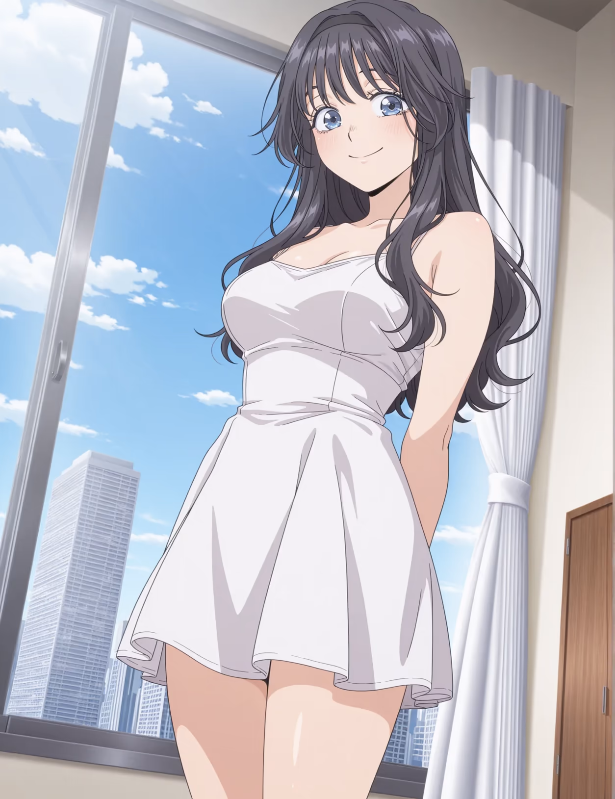 The late afternoon sun cast long, golden shadows across the polished floorboards of his apartment, painting the room in hues of warmth and quiet intimacy. Kaoruko Waguri, a vision of elegance even in her school uniform, sat on the edge of the sofa, her hands clasped delicately in her lap. The air between them was thick with an unspoken anticipation, a delicate tension that had been building for weeks, subtly, beautifully, like the slow unfolding of a precious flower.