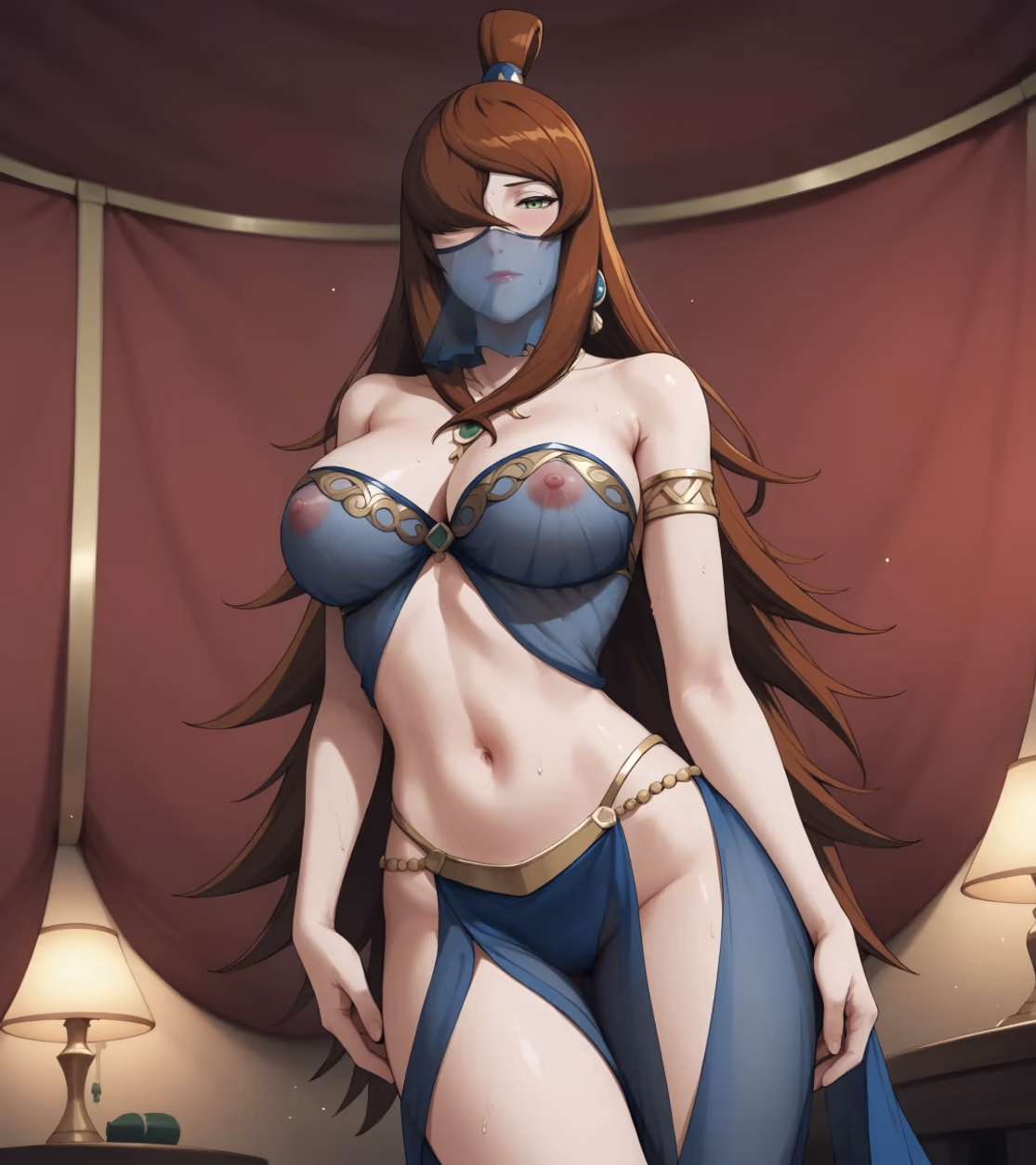 The humidity in the Village Hidden in the Mist was particularly thick that evening, a heavy blanket of moisture that clung to the skin and blurred the lines between the sea and the sky. Inside the Mizukage’s private residence, Mei Terumi stood by the floor-to-ceiling window, watching the swirling vapors dance around the jagged peaks of Kirigakure. She was dressed in her signature dark blue gown, the fabric hugging her curvaceous silhouette in a way that left little to the imagination, the high slit revealing the smooth, toned length of her legs.