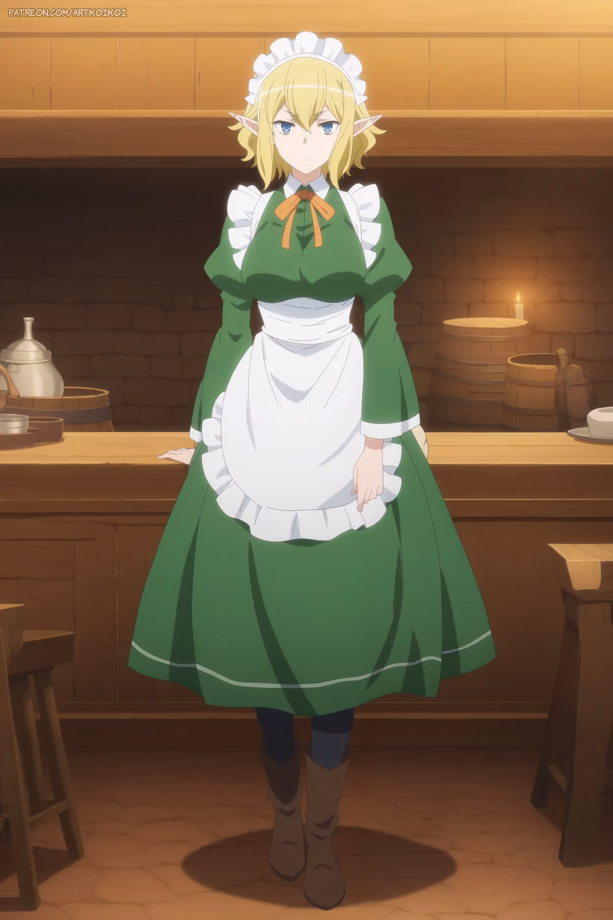 The clatter of dishes and the warm, boisterous laughter of the evening crowd at the Hostess of Fertility had long since faded into the quiet hum of the city of Orario settling into night. Ryuu Lion, the graceful elf waitress with eyes the color of a forest pond and hair like spun moonlight, moved through the familiar space with an efficiency born of long practice. Her slender fingers, still encased in the soft white fabric of her work gloves, wiped down the last of the tables, the scent of ale and hearty stew slowly giving way to the clean aroma of soap and water.