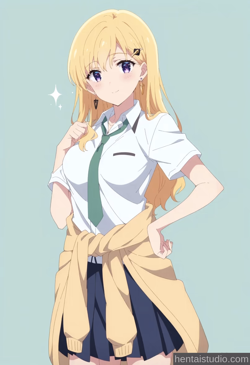 The scorching summer sun beat down on the small, secluded cove, painting the turquoise water with streaks of shimmering gold. Saki Ayase, her usually prim and proper demeanor softened by the heat and the gentle lapping of waves against the shore, stood at the water's edge. Her blonde hair, a cascade of spun sunlight, was tied back loosely, a few rebellious strands framing her flushed cheeks.