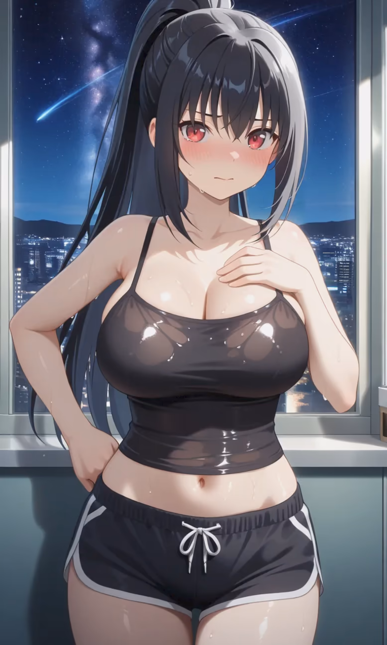 The silver moonlight of Tortus spilled through the tall, arched windows of the training hall, casting long, dancing shadows across the polished wooden floor. Shizuku Yaegashi, the renowned swordswoman from Arifureta: From Commonplace To World's Strongest (shokugyou De Sekai Saikyou) , moved with a fluid, lethal grace that belied the turmoil churning within her heart. Her black hair, usually tied in its signature high ponytail, had partially come loose, strands clinging to her damp, flushed skin.