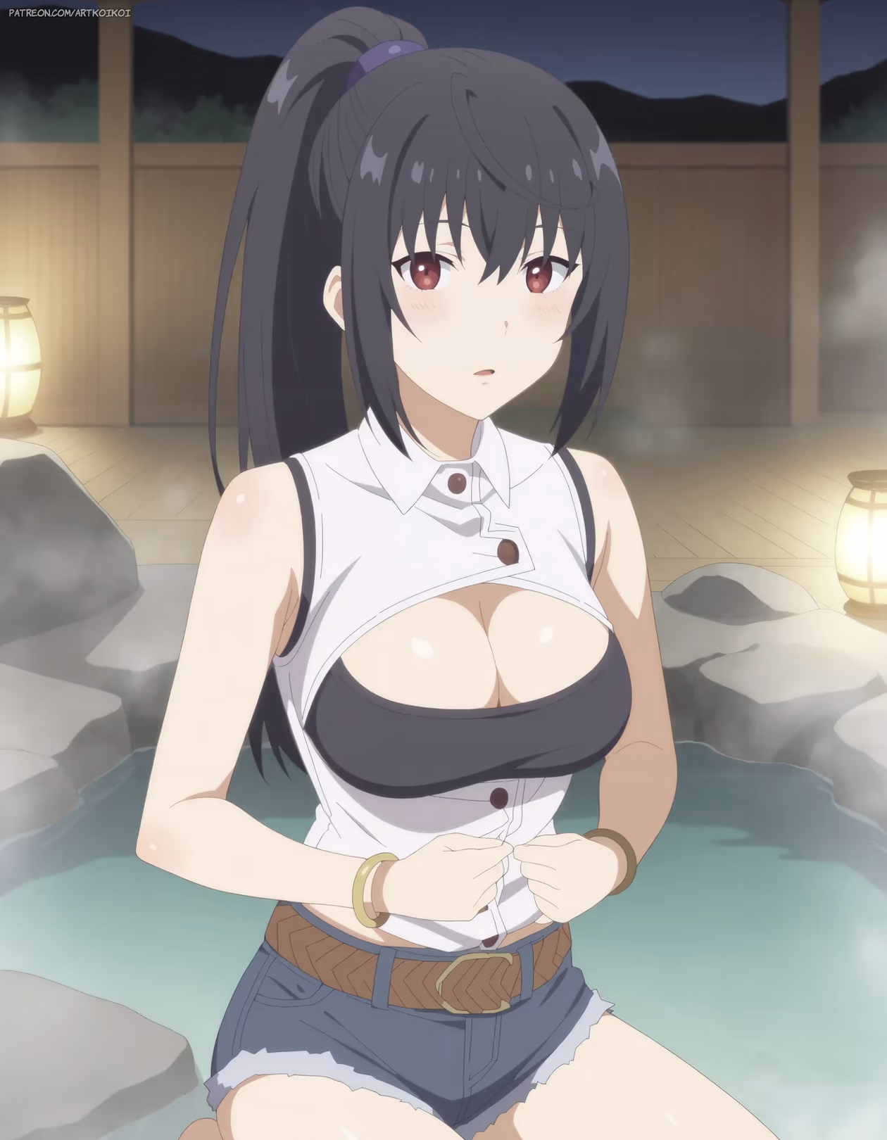 The air in the hidden grotto of the Haltina Woods was thick with the scent of blooming night flora and the heavy, sulfurous mist of a natural onsen. The water, magically heated by the subterranean veins of the world, shimmered like liquid sapphires under the pale moonlight filtering through the dense canopy above. Shizuku Yaegashi , the stoic and reliable swordswoman of the hero’s party, stood at the edge of the stone basin, her breath hitching as she unfastened the dark fabric of her traveling gear.