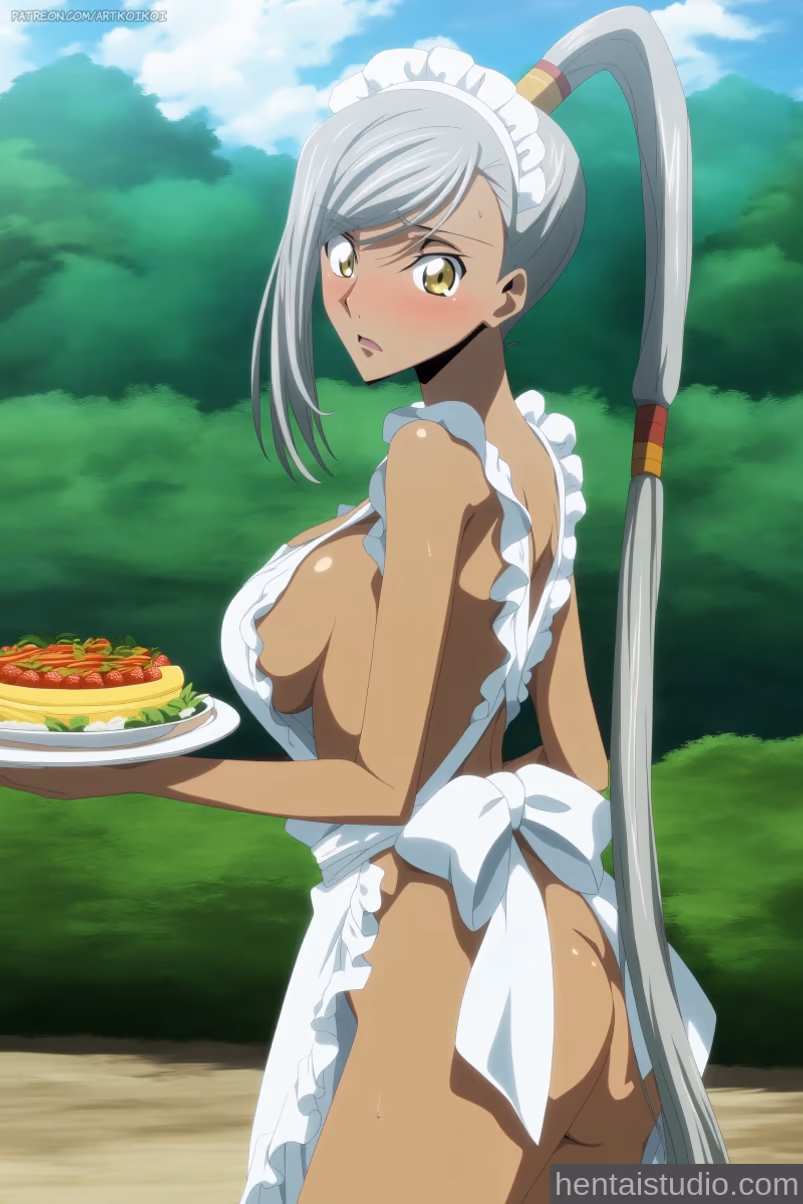 The late afternoon sun, a painterly smear of gold and rose across the Neo-Britannian sky, cast long, languid shadows across the manicured gardens of the Emperor's secondary residence. Within the quiet elegance of her private chambers, Villetta Nu, Knightmare pilot and loyal servant, found herself adrift in a sea of unspoken desires. The crisp white of her maid uniform, a stark contrast to the fiery hues outside, did little to conceal the subtle flush that bloomed on her cheeks, a testament to the simmering heat within.